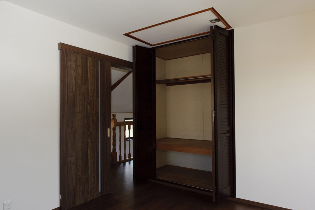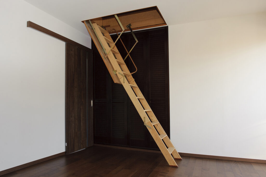 天井から伸びるはしごを使って上ると、屋根裏につながる洋室です。