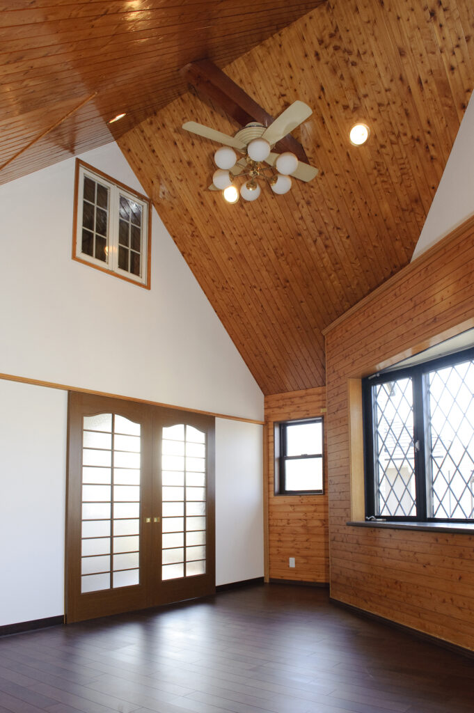 壁から天井まで全体を木で囲んだリビングは、白いシーリングライトとマッチしておしゃれなログハウスのような仕上がりになっています。