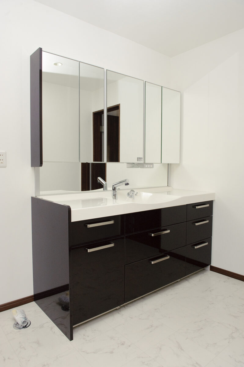 洗面台は、鏡が大きいので家族が横並びでお化粧ができます。