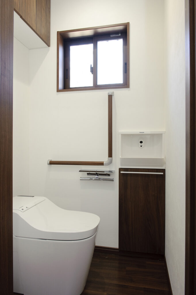 トイレは木製の手すりが付いたバリアフリー対応で、収納も多く使い勝手が良いです。