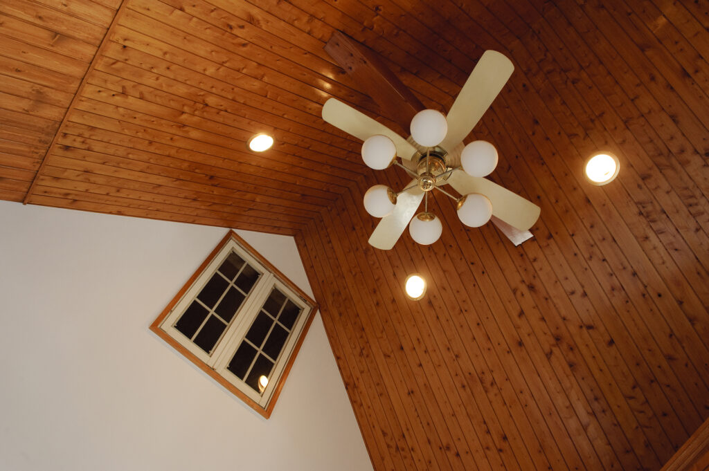 天井に設置された白いシーリングファンライトは、周りの無垢材との相性抜群です。