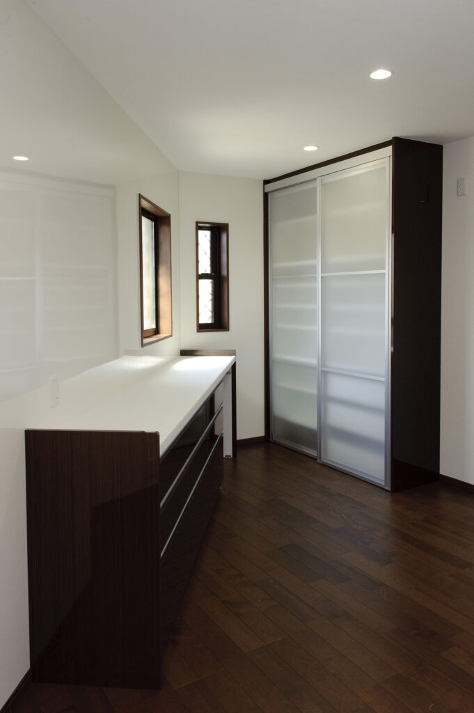 こだわりの無垢材で建具を構成することで木のぬくもりを感じる空間に。水まわりは使い勝手が良く大容量の収納スペースを確保できる設備にいたしました。